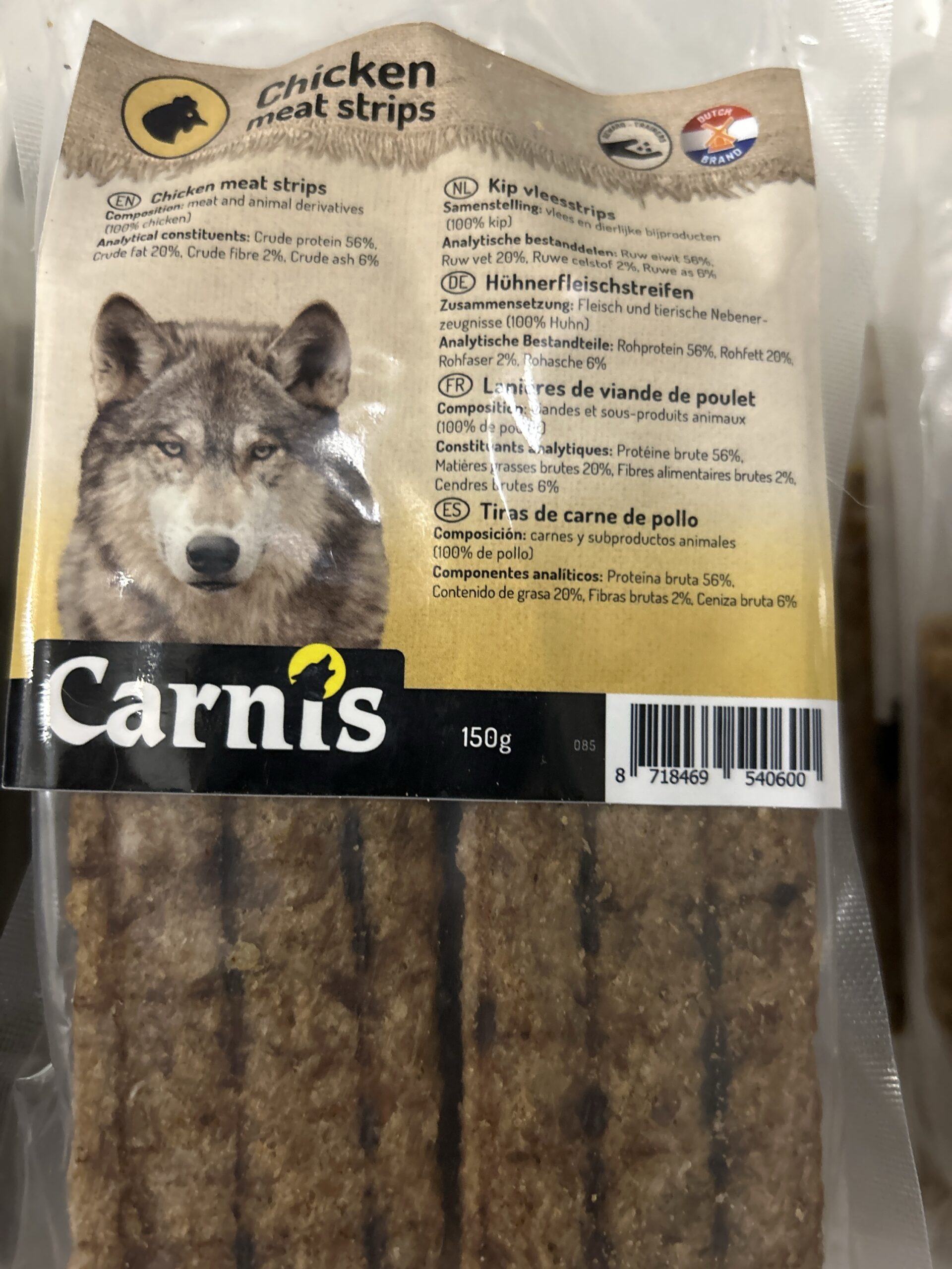 Carnis kip vleesstrips zijn een smakelijk tussendoortje, gemaakt van 100% kip. Doordat je de strips eenvoudig in stukjes kunt breken, zijn ze ook zeer geschikt als trainings- en beloningssnack. De strips zijn ongeveer 11 cm per stuk.