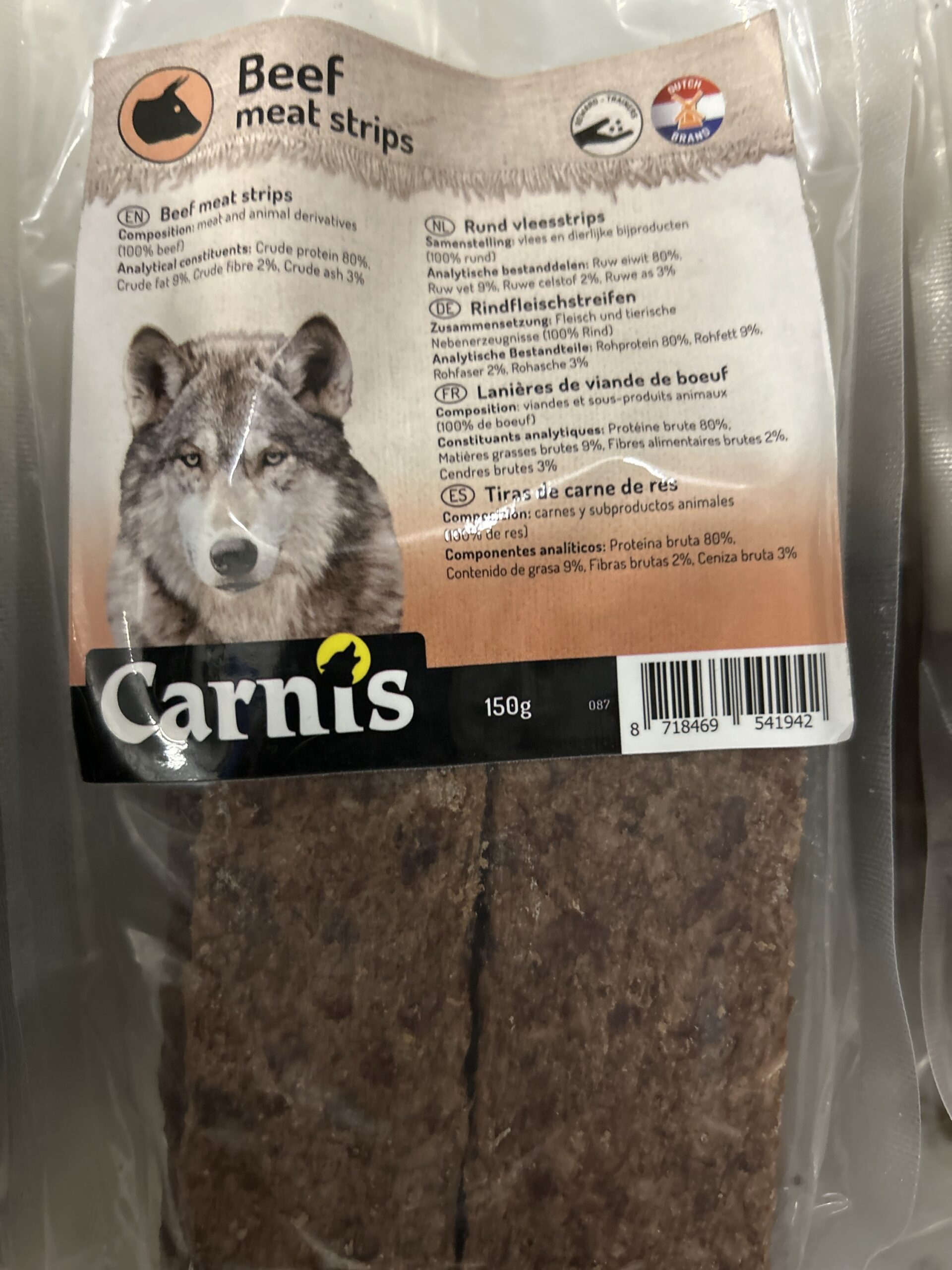 Carnis rund vleesstrips zijn een smakelijk tussendoortje, gemaakt van 100% rund. Doordat je de strips eenvoudig in stukjes kunt breken, zijn ze ook zeer geschikt als trainings- en beloningssnack. De strips zijn ongeveer 11 cm per stuk.
